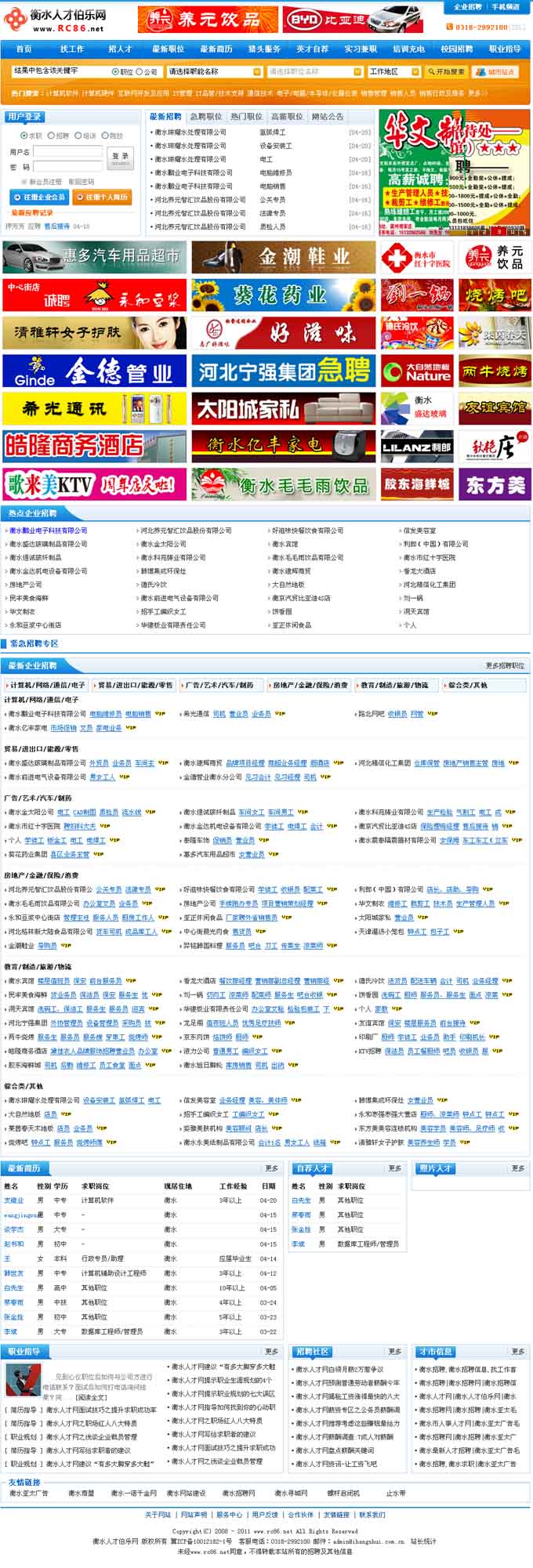 全新的界面設(shè)計(jì),“紙媒+網(wǎng)絡(luò)+現(xiàn)場(chǎng)”三位一體的人才互動(dòng)平臺(tái)--衡水人才伯樂(lè)網(wǎng)(www.rc86.net)于2011年4月10日全新上線,界時(shí)衡水亞太廣告紙媒將展開(kāi)衡水人才伯樂(lè)網(wǎng)全面的宣傳攻勢(shì),為衡水企業(yè)、商戶(hù)招聘人才提供一個(gè)全新的互動(dòng)交流平臺(tái),同時(shí)也為各界精英提供選擇就業(yè)崗位的新平臺(tái),歡迎注冊(cè)企業(yè)用戶(hù),歡迎上傳個(gè)人簡(jiǎn)歷!