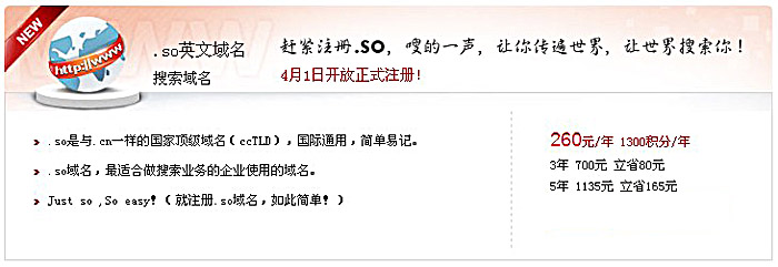 2)“so”這個(gè)單詞在英文中的意思——“因此,如此”,是一個(gè)非常常見(jiàn)的單詞,如sina.so(新浪如此),easy.so(如此簡(jiǎn)單),有趣易記。