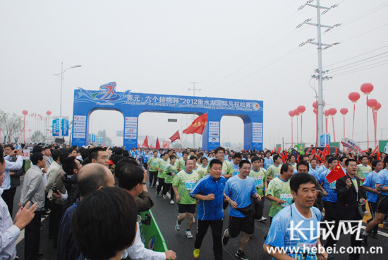 發(fā)令槍響起,2012衡水湖國際馬拉松賽開跑。扈煒 攝